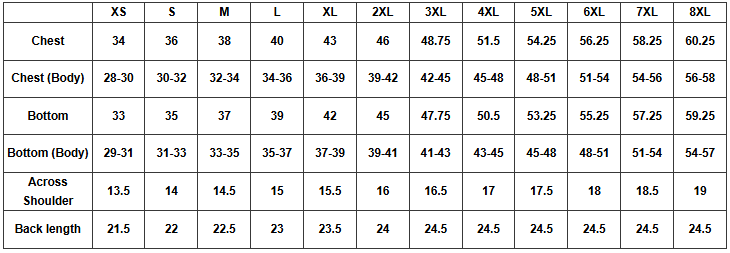 | Chest (Body) | 28-30 | 30-32 | 32-34 | 34-36 | 36-39 | 39-42 | 42-45 | 45-48 | 48-51 | 51-54 | 54-56 | 56-58 |